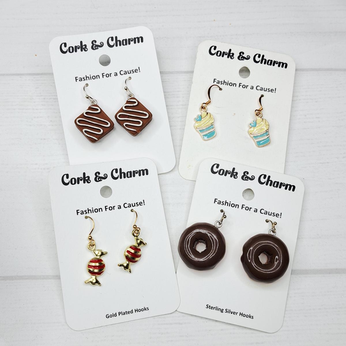 Cork and Charm sells novelty and themed earrings as well as EyeDecos (charms for your eyeglasses) and donates 50% of profits to charities and nonprofi