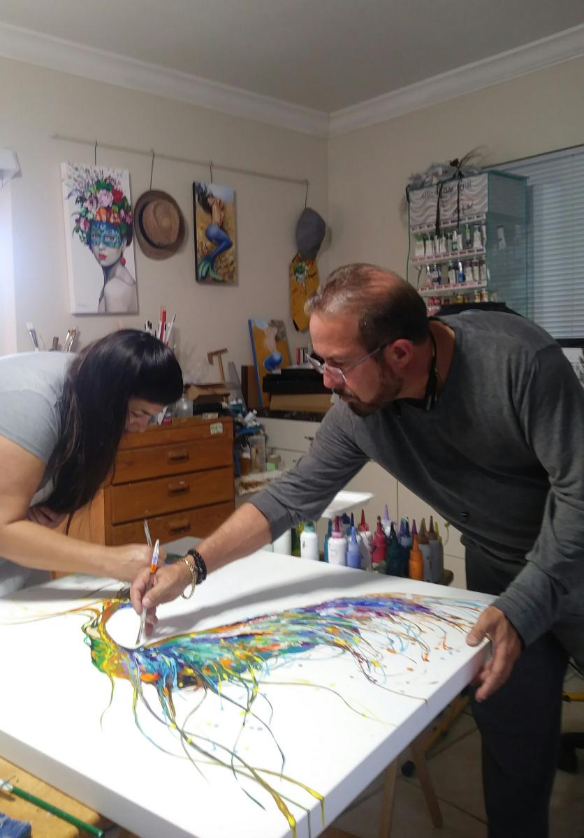 Bouzon Muxo Fine Art is an artistic collaboration of two artists who work simultaneously “Gina Muxo Ramos and Orestes Bouzon”. Gina Muxó Ramos is a self-taught artist who live in Miami, Florida and is working alongside Orestes Bouzon, an artist who studied at the Academy of Art San Alejandro in Cuba. Both Gina and Orestes are well established artist and widely exhibited, who met via the art scene and have developed an amazing friendship and working relationship. During a conversation on how similar both artists are, they discuss creating a joint series that would merge the best of all their techniques and ideas.