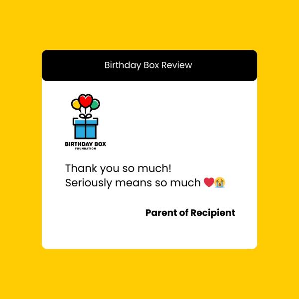Every child deserves to feel seen, celebrated, and included, especially on their birthday. Birthday Box Foundation ensures children experiencing hardship are able to celebrate their birthday at home, the hospital or shelter. Birthday Boxes filled with cake making essentials, party supplies, decorations, gifts, and books, empower families to create joyful childhood memories, and strengthen family bonds, fostering a sense of security and love within the home.