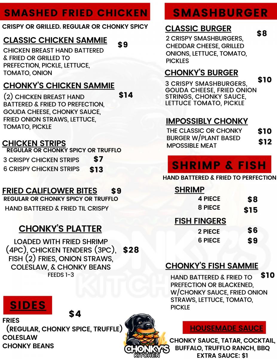 Step into a crispy Chonky adventure where every bite tells a story of crunch and flavor. At Chonky's Kitchen, we specialize in crafting mouthwatering delights that elevate normal food to an explosion of deliciousness. Picture this: hand-battered to order, fresh fried chicken, shrimp, and fish cooked to golden perfection, each bite a symphony of crispiness and succulence. But that's not all. Our menu proudly boasts our signature smash burgers, made to order for that perfect balance of juiciness and crunch. And what's a dish without the perfect sauce? Our homemade sauces and seasonings add that extra touch of magic, turning every meal into an unforgettable experience. Join us on a journey where taste knows no bounds and satisfaction is always on the menu.