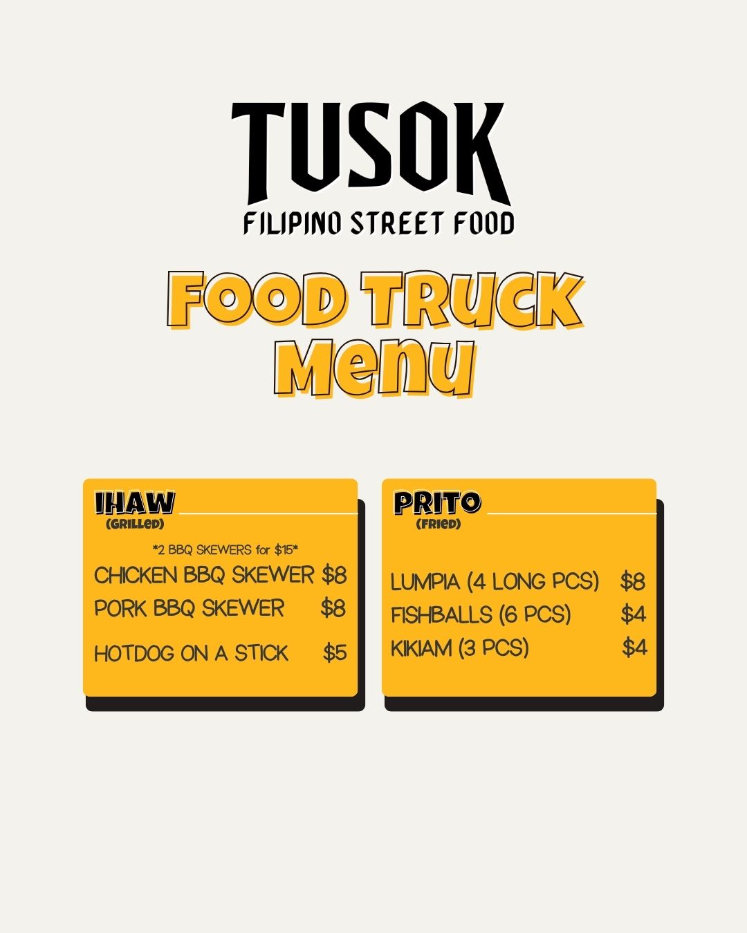 We’re Nathan and Patricia, the couple behind Tusok Truck (formerly Kanto Filipino Street Food). This is more than just our small business, it’s a family effort. We bring classic Filipino hits to New Jersey, serving street food favorites like lumpia spring rolls, fishballs, and more.