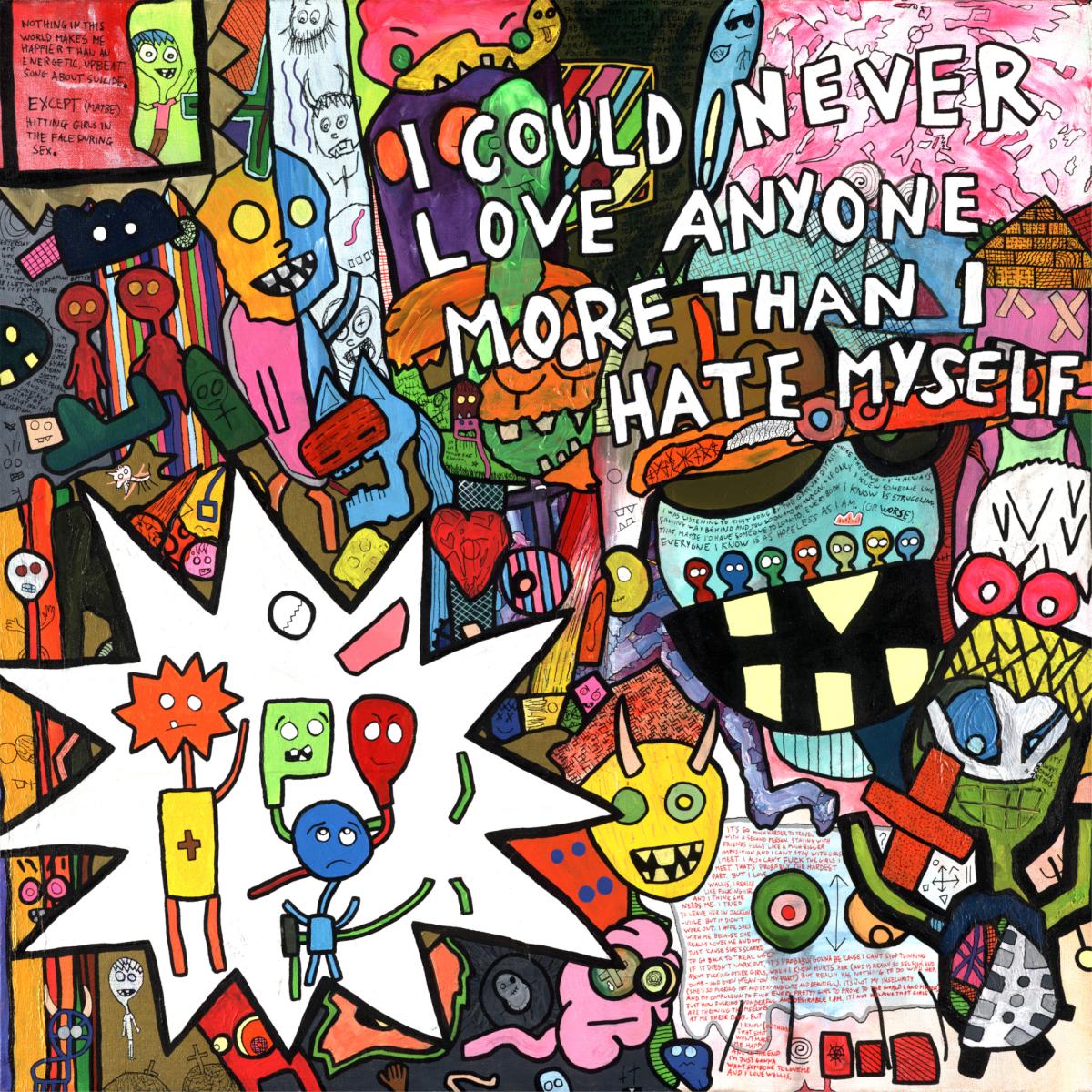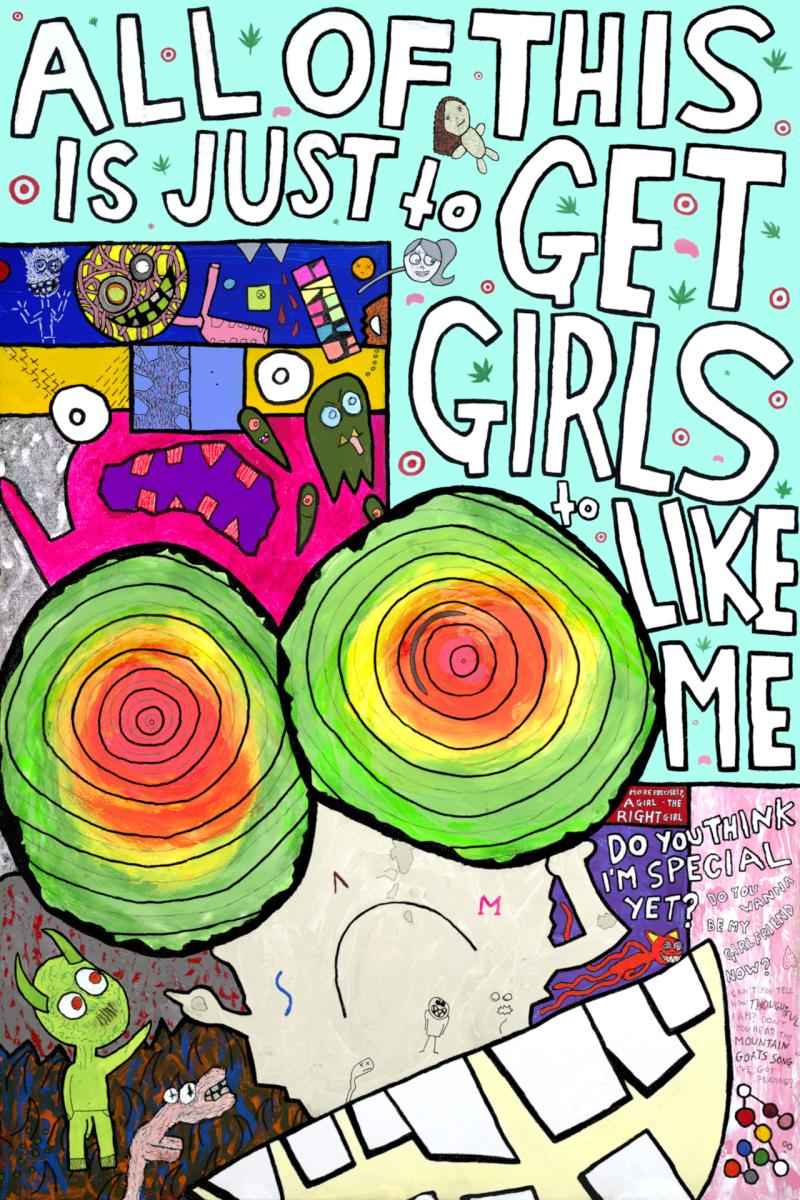 Bright colors, rotten smiles, and mischievous titles in bold block-lettering jump off the canvas, but it’s the hidden details and intensely personal small-print journals that sink their hooks in.