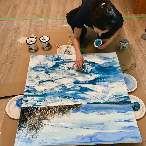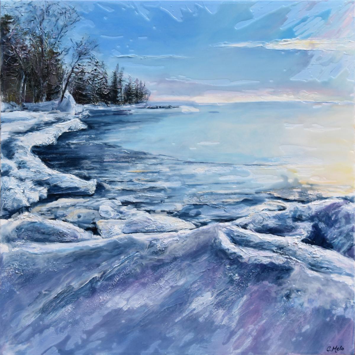 Celina Melo is a landscape painter, who works in acrylic and mixed media. Georgian Bay has become her muse, whether depicting a summer sunset or icy shoreline. Moving across the heavily textured canvas, the lustre of the pouring medium mimics the sparkle and dynamism of water. Bold textures balance and contrast with the delicate sheen, just as nature and life grace us with tranquility and engulf us simultaneously. Gestural lines and reflective pools of pouring medium lie over aspects of painted imagery to create a landscape that meanders between abstraction and realism.