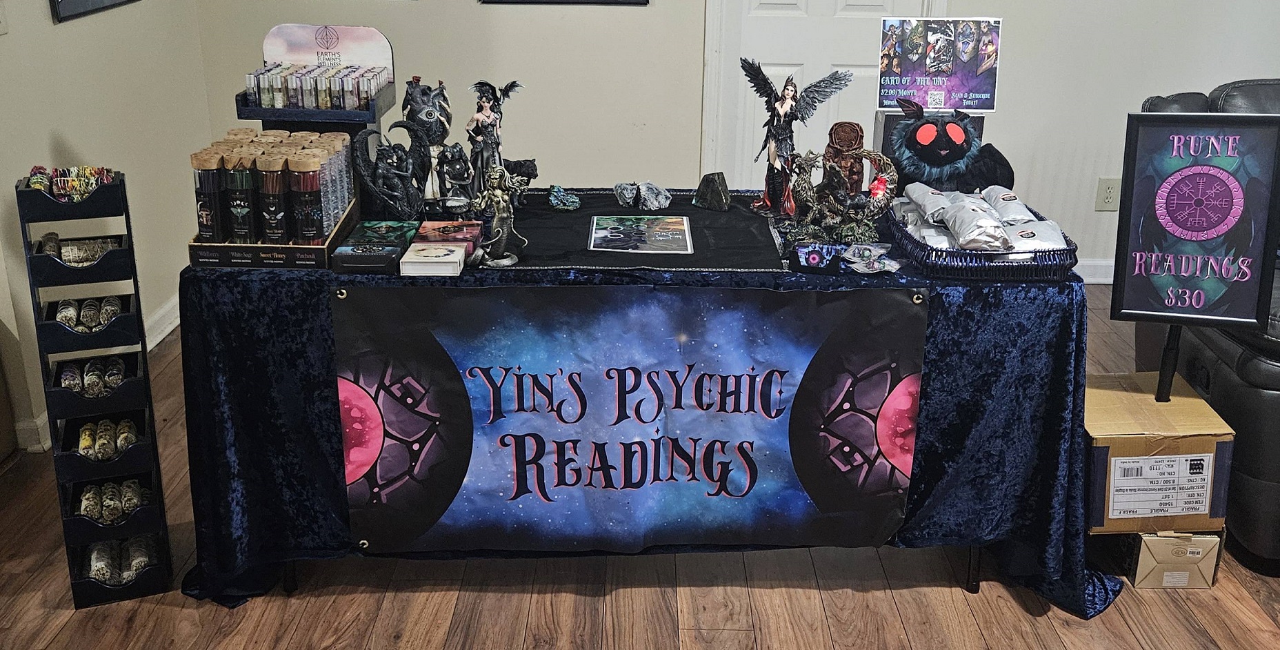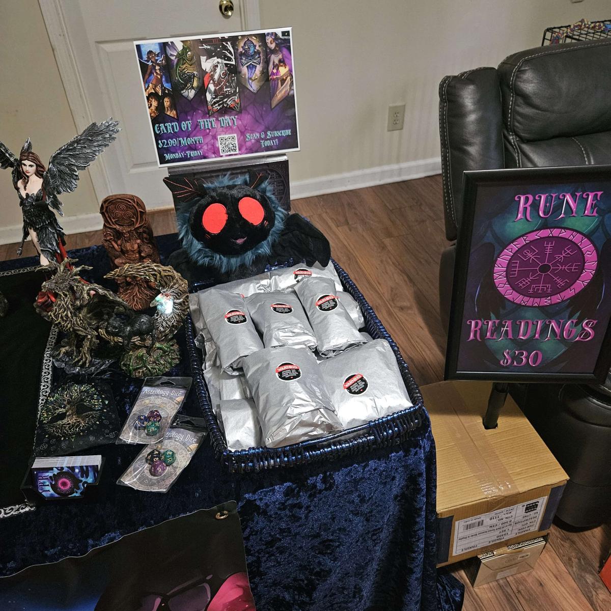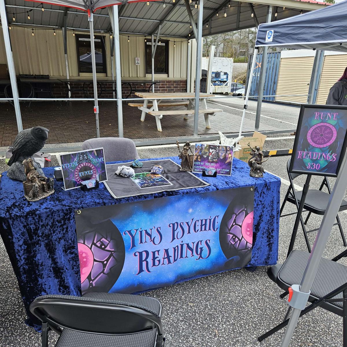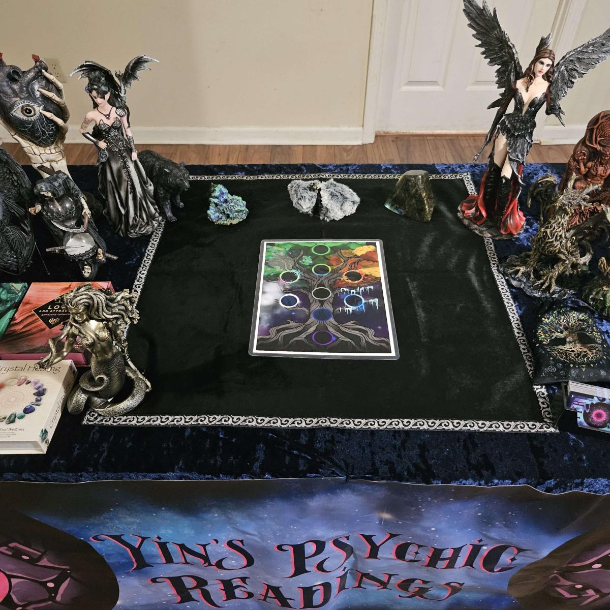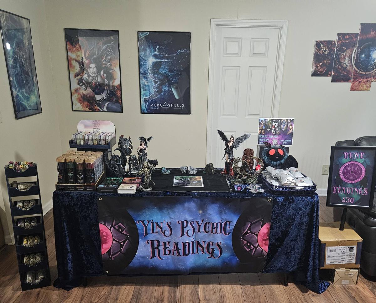 I perform psychic readings/fortune telling services that include Tarot Cards, Norse Runes, etc. I also carry a variety of occult supplies, décor, and paraphernalia.