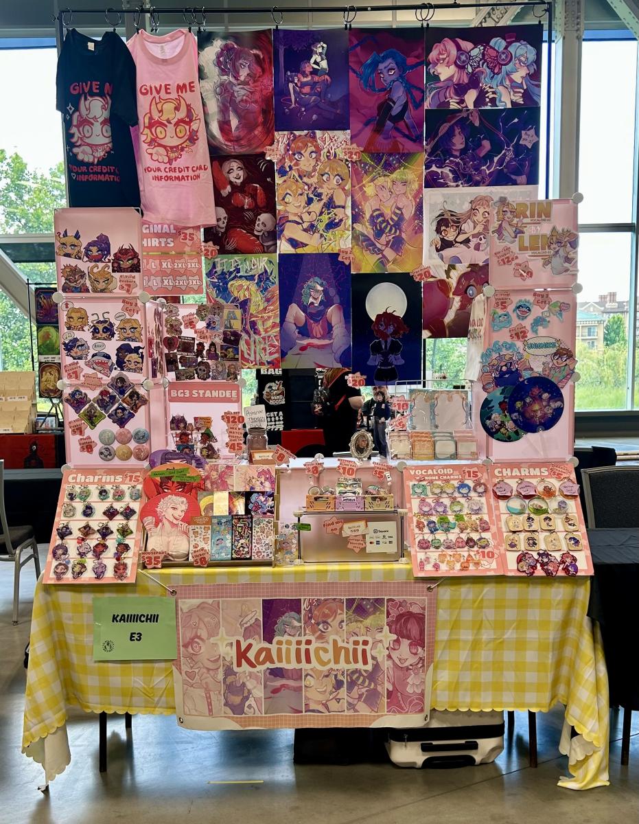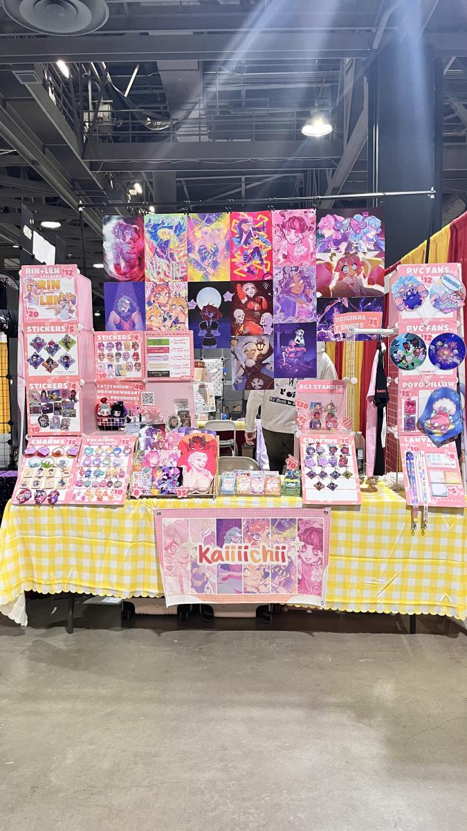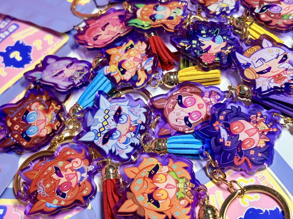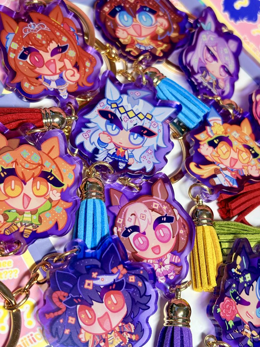 I sell prints, acrylic charms/standees, stickers, dakimakuras, lanyards, plush dolls, mousepads, and more!