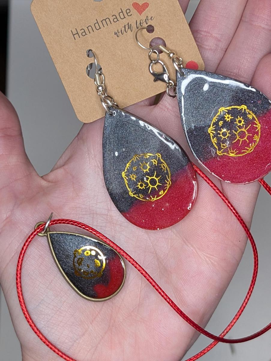 Show your love for the galaxy far, far away in a more understated way with these inspired earring and necklace combo sets. Featuring color combinations reminiscent of your favorite factions, these sets offer a touch of nerdy style that's still chic and versatile. This is the one from the set that was not hypoallergenic. All non hypoallergenic items are being discontinued and are discounted.This item is not hypoallergenic. Not suitable for those with sensitive ears.This item is handmade, so there may be slight imperfections and variations in its characteristics, which add to its unique charm.