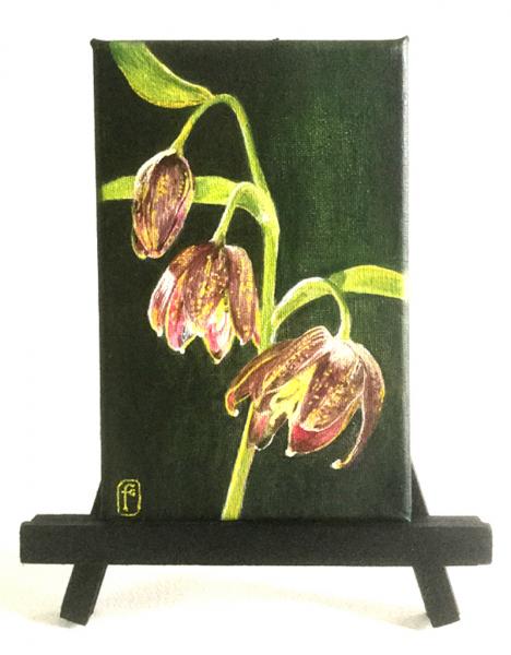 Acrylic painting on canvas of fritillaria on a dark background. The actual painting size is 7" x 5" and mounted on a small easel.