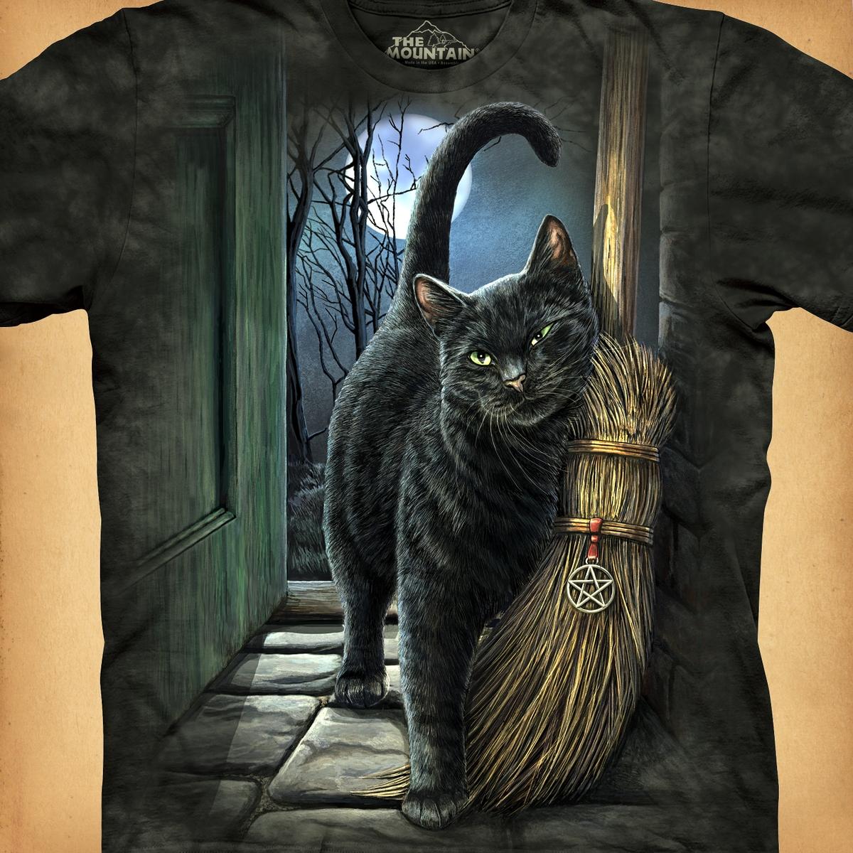 • Pre-shrunk 100% cotton • Hand-dyed background • Environmentally-friendly, water-based dyes • Available in sizes Small to 3X Large Please note: We will not be restocking these shirts. If you see something you want in your size, grab it! :) The night is dark, the moon is full, and it's time for a midnight ride. Make no mistake, that is no ordinary broomstick. If nothing else, the pentacle hanging from its bristles would tell you that. But more than anything, the deep intelligence and utter confidence in the black cat's eyes should tell you that he is quite at home with all the spells and enchantments he has encountered thus far. The artwork for this t-shirt was created by renowned fantasy artist Lisa Parker.
