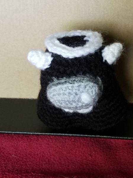 An Alice Angel version of a crewmate, hand crocheted by me. She squeaks when squeezed and has horns, a halo, a dress with a bow, and a little bow on her backpack. Crossover between Among Us and Bendy And The Ink Machine.
