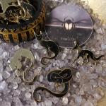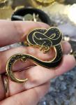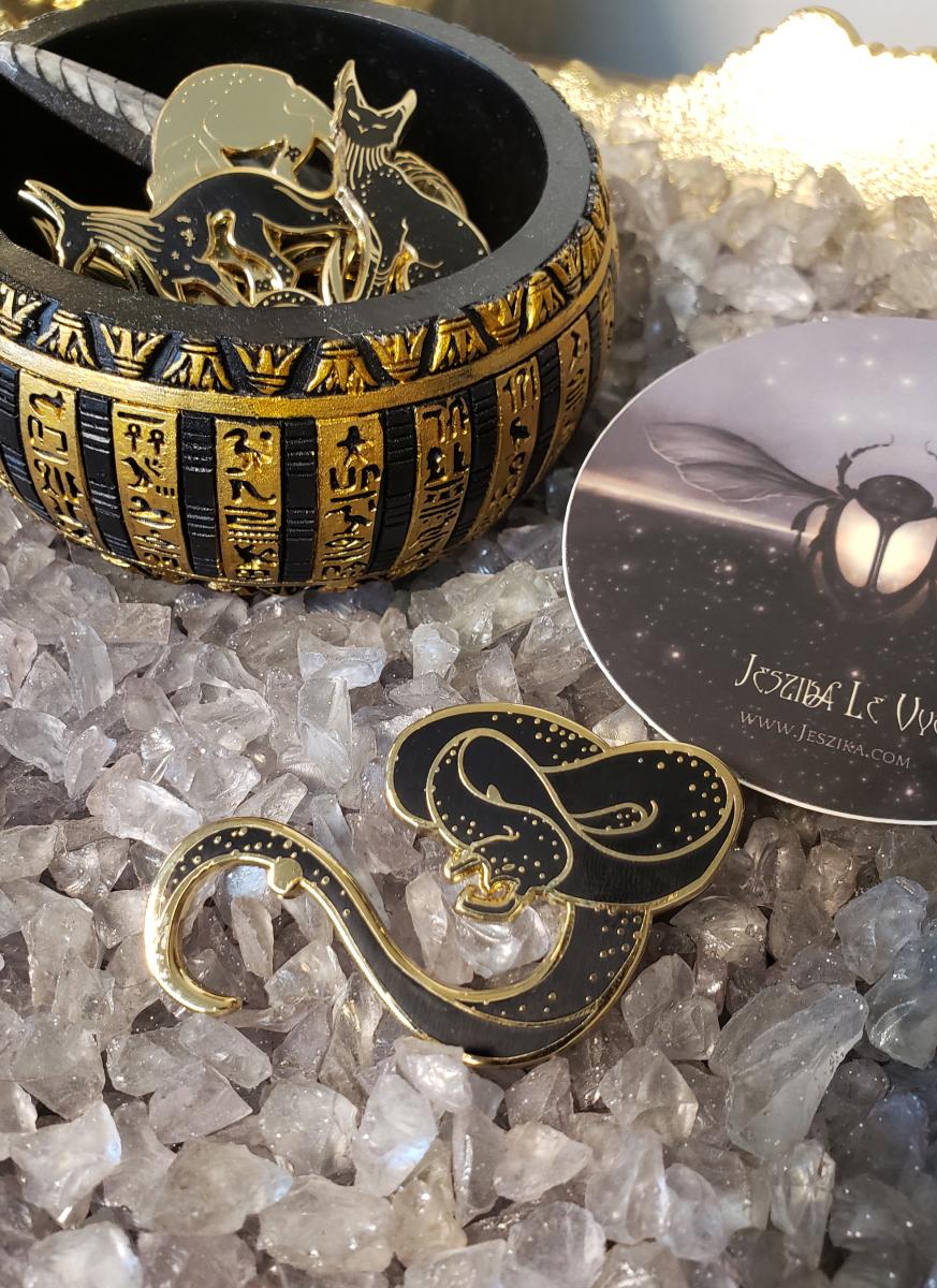 Apep was the Egyptian demon god who represented darkness and chaos. It was said each night he tried to devour the sun and the gods had to battle him to preserve the universe. For anyone who loves Egyptian mythology and the elegant shapes of snakes - these elegant Apep pins are over 2 inches tall from coil to tail with two rubber backings. They are hard enamel pins with gold detailing.