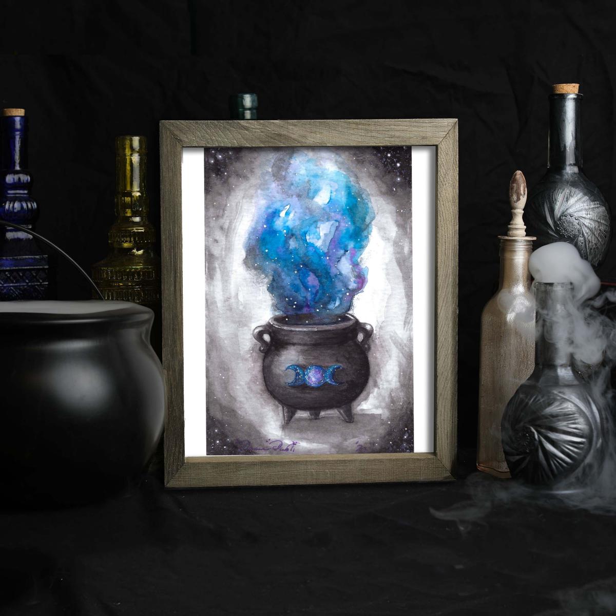 Triple Moon Goddess Cauldron Art Print - Halloween Art, Witchy Home Decor, Spooky Wall Art, Magic Art Print, Astral Cauldron, Space and Galaxies, Crescent Moon