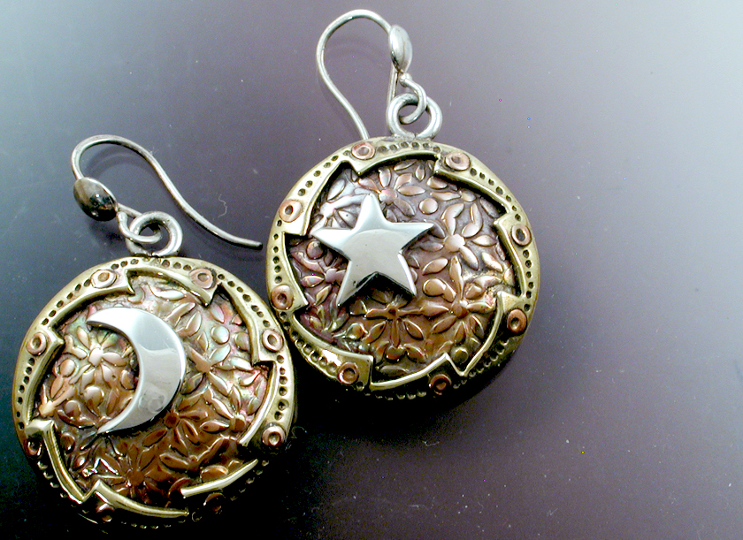 A set of mixed metal earrings with a brass spinning sun riveted to a backing of roller printed patterned copper. One has a silver star, the other a silver moon.