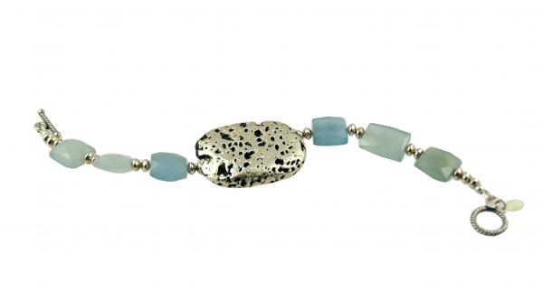 My Baby Blue Glow bracelet is hand-gilded volcanic lava stone with white gold leaf, luminescent chalcedony, shiny sterling silver saucer beads, easy-to-grasp sterling silver toggle clasp along with my designer signature tag. It is light and comfortable to wear. The bracelet measures 7.5" Hand models are slightly smaller than life- size Ready to Ship in a Lovely Gift Box with Bow. . . You Might Also Like: See More Here: https://www.eventeny.com/company/?c=10128