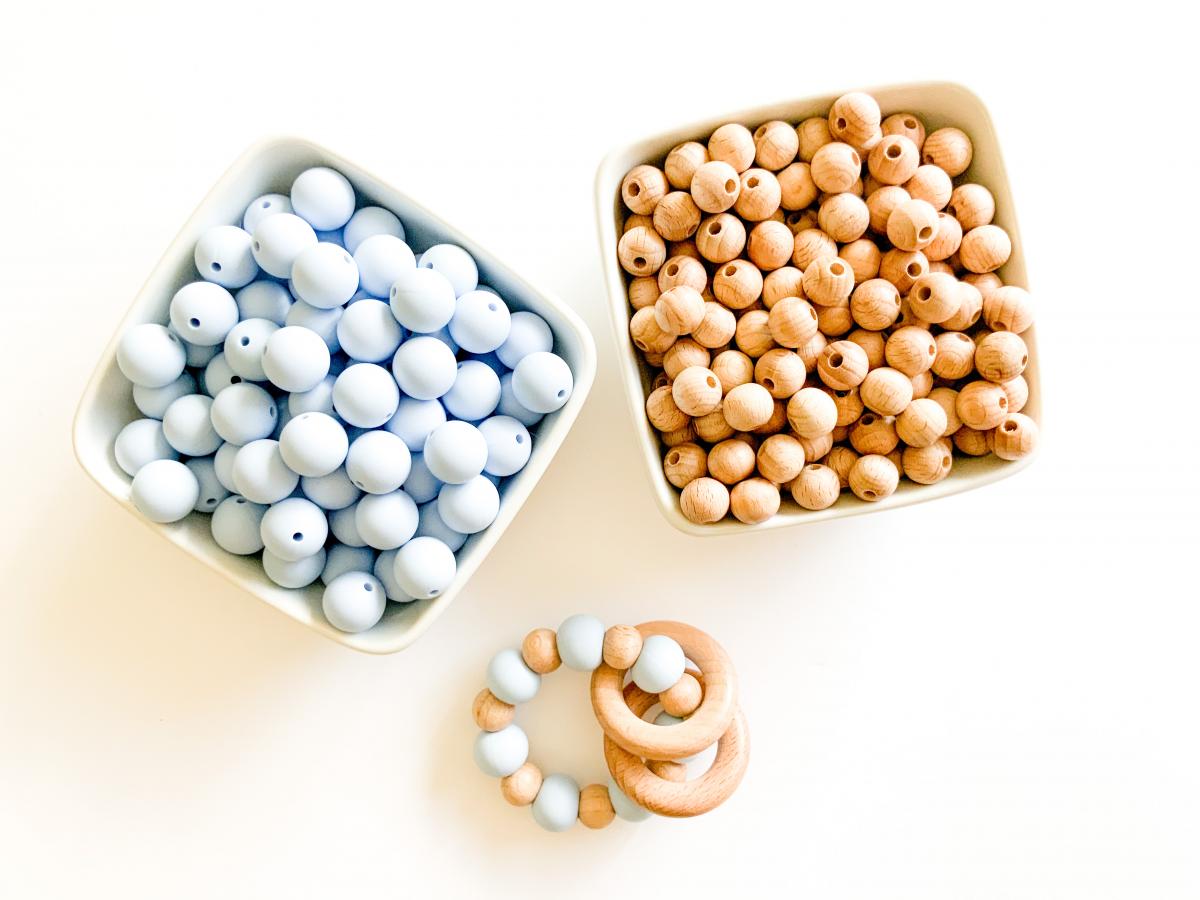 They are made with food grade silicone beads which gives them a softer smooth texture to chew on along with untreated beech wood which provides a harder texture to help relieve that uncomfortable teething pain.