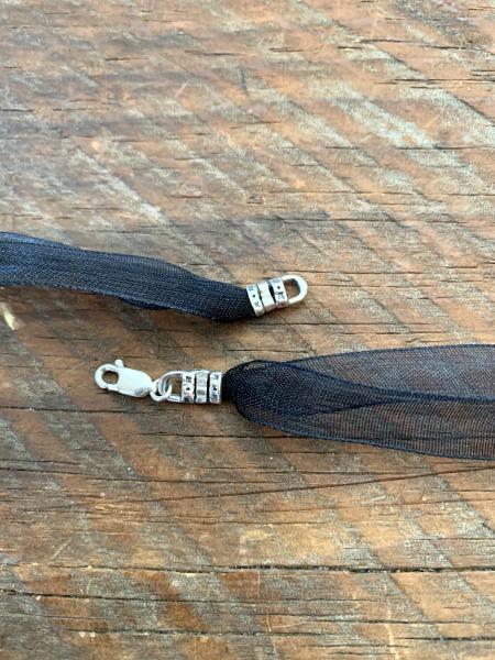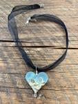 Lampworked glass heart pendant, soft aqua waves and sand. Sterling silver findings on 16", 18" or 24" black chiffon necklace.