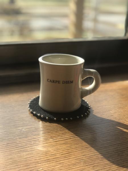 Individual coaster with beaded edges. Coasters are made from felted wool and measure 5 inches in diameter and are handstitched. Spot clean with a damp cloth or handwash if necessary and dry flat.