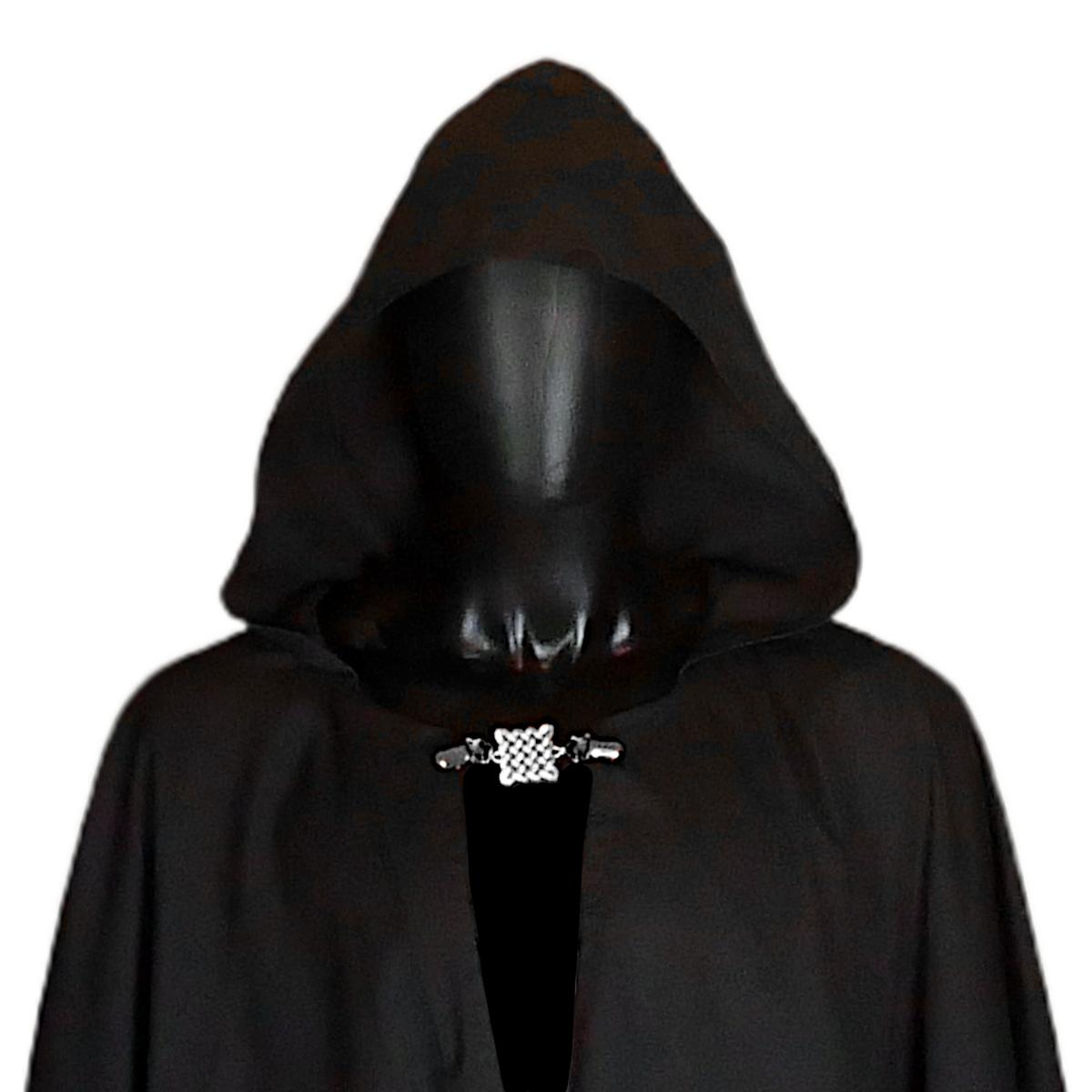 • Full-circle design • Hooded style with pockets • Closes with a removable metal clasp • Machine washable. Easy care. Plain and simple, this cloak goes anywhere and works with everything. Made from medium-weight black poly-cotton twill, it drapes nicely but keeps a little crispness in its shape. The result is a cloak that hangs well, moves easily, and always looks put-together. The fabric has a clean, matte finish — sturdy enough for everyday wear, but soft enough to move comfortably. It’s not a fuzzy or insulated fabric, so this cloak won’t offer a lot of warmth on its own, but it’s perfect for layering or for days when you want coverage without overheating. The roomy hood adds warmth and presence, and the deep pockets are ready for whatever small essentials you need to carry. This full-circle cloak measures 42" from the back of the neck to the hem. It closes at the neck with a large silver-tone Celtic knot clasp that removes easily for laundering. Every cloak we make is sewn with care and attention to detail, from the flat-felled seams to the double-stitched hems.