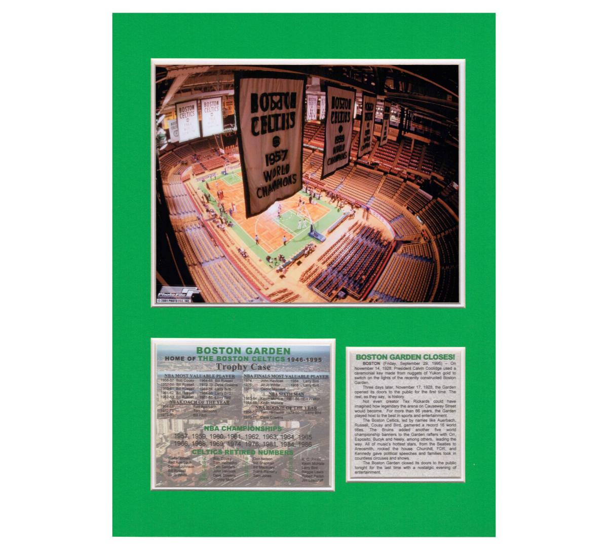 Wall decor that is a Tribute to Boston Celtics Final Game at Boston GardenFeatures:- one licensed 8 x 10 picture- a news story about the game- a Trophy Case statistical summary of Celtics at the arenaThis Tribute is double matted and ready for a 16 x 12 standard size frame of your choice.