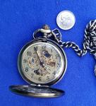 The mechanism can be seen from the front and the back. The front of the case opens for ease of reading time (and to be cool). Recommend winding morning and evening to avoid loss of minutes due to spring winding down. Watch chain is 14” long
