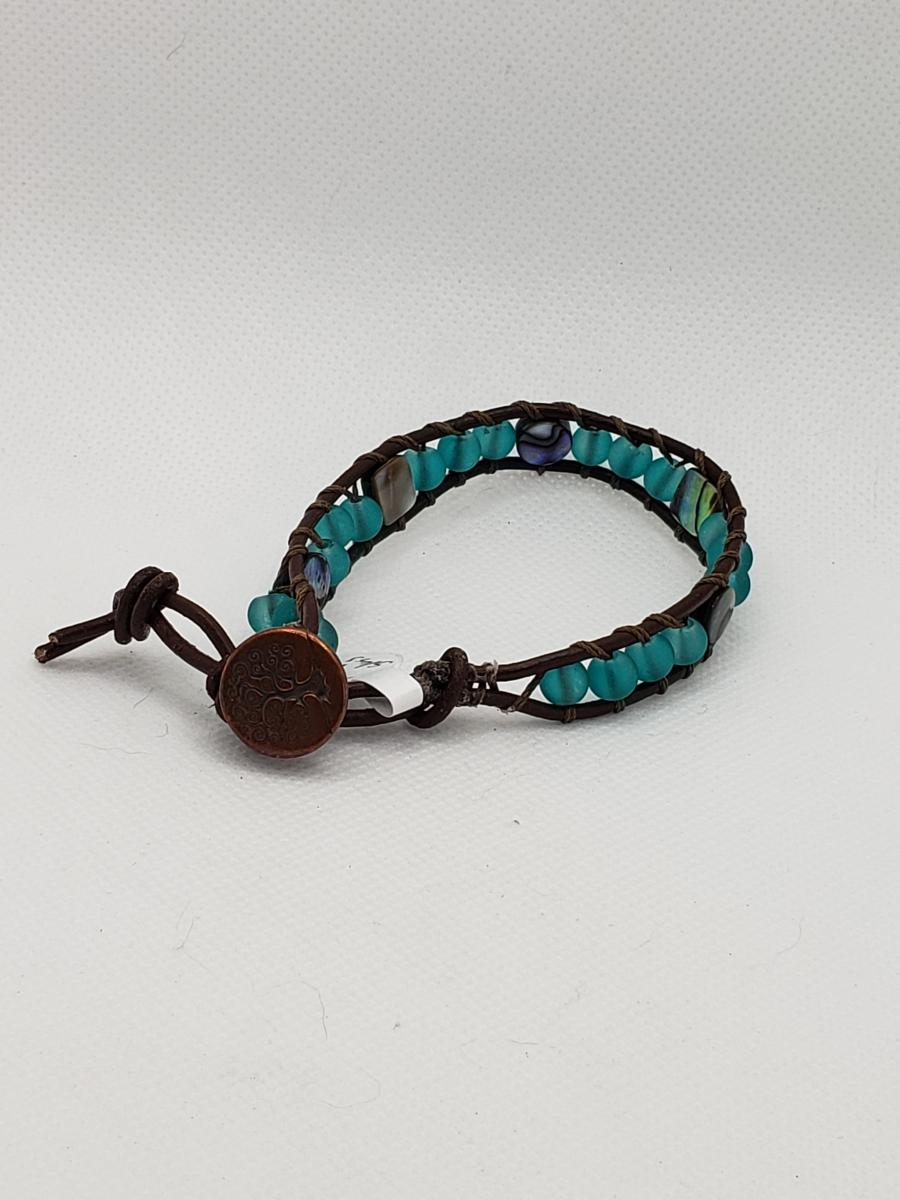 Brown Leather Bracelet with aqua sea glass and abalone shell beads