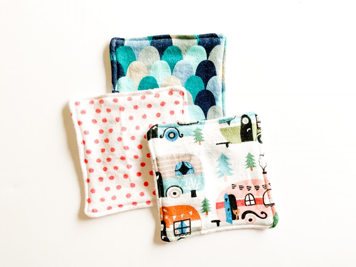 Our 3 pack wash cloths are made with flannel and terry cloth backing. The flannel becomes so soft in water which is great to use for your little ones. These are great for all ages. Small enough to use on babies but also a great size for toddlers and young children to use themselves during bathtime.