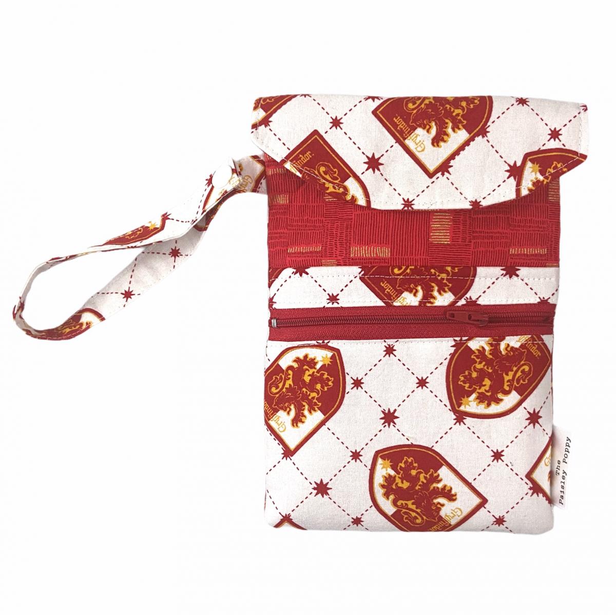 This adorable wristlet is just right for carrying the essentials with ease without having to carry a large handbag. The main pouch secures with a magnetic button close and easily fits the largest smartphone or sunglasses with room to spare. The front zippered pocket is roomy enough for things like driver's license, credit cards, cash and other small items. The 1 inch wide strap has a snap closure for easy hanging on things like stroller handles, belt loops, etc. Bag measures approximately 7.5" x 5.5" zippered pocket measures approximately 5" x5.5" Strap is approximately 12" unsnapped