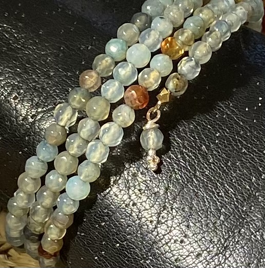 Brown agate and blue chalcedony 3mm bead triple coil on memory wire with .925 silver beads on the dangles.