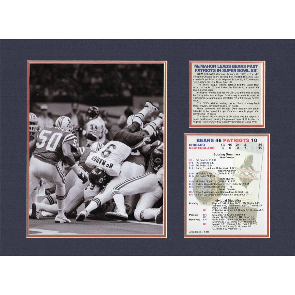 Wall decor that is a Tribute to Chicago Bears who won the Super Bowl led by quarterback Jim McMahonFeatures:- one licensed 8 x 10 picture- a news story about the game- a a box score of the gameThis Tribute is double matted and ready for a 12 x 16 standard size frame of your choice.