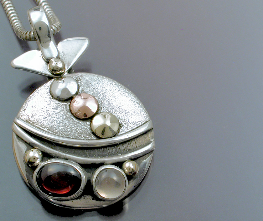 A circular shaped pendant of sterling silver with design elements of copper and gold. Set with cabochons of Orissa garnet and Moonstone. The price includes a sterling silver snake chain, please let me know which length you would prefer, 16, 18, 20 or 22 inches.