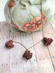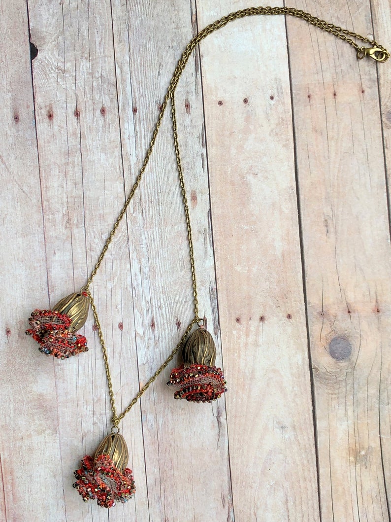 For each of the three hanging flower blossom pendants on this one-of-a-kind necklace, tiny, iridescent, metallic beads were crocheted along the edges of layers of pale beige tulle using perle cotton, hand-dyed in colors reminiscent of a Frida Kahlo painting. The embellished tulle swirls out from the cupped, antique brass metal flowers, creating enchanted blooms hanging from a fine brass chain. The effect is unique and breathtaking! The necklace is 24 inches long and closes with a brass lobster claw clasp. Each floral pendant is about 1 1/4 inches long and 1 1/4 inches in diameter.