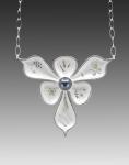 This pendant reminds me of the columbine that grew all around my old house in Massachusetts. Even though true columbine has more than six petals, I still see it. It’s made of sterling silver with 18k gold accents and fine piercings that echo the subtle patterns on the metal. There is a fresh water pearl in the center. It measures 2 1/2” x 2 1/4” x 1/4”. The cable chain is 18” long with a 4” extension.