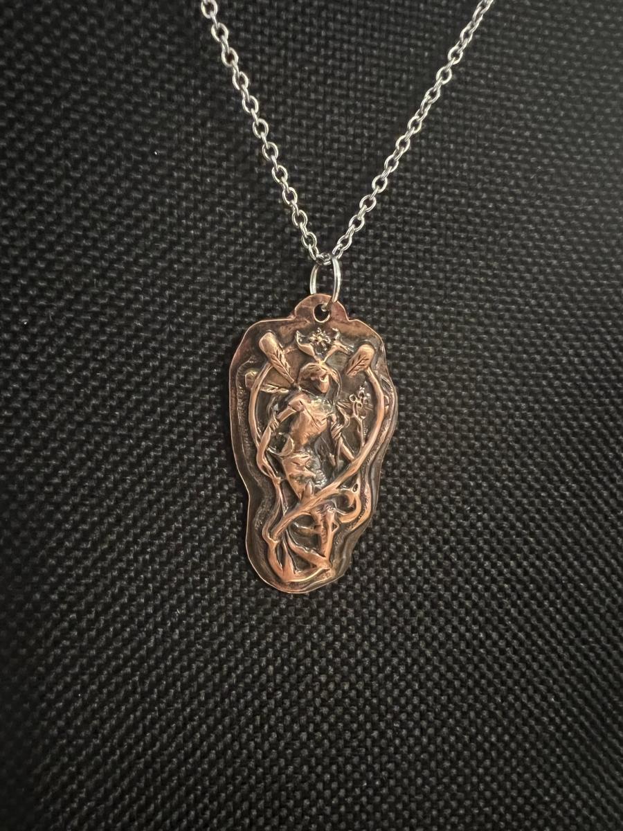 Formed copper pendant of fairy with vines on a stainless steel chain. Chain length 20-22"