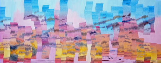 Mixed media painting (refractured watercolor, acrylic). Depiction of clouds at dawn - but with wild colors - orange and dark red. The abstraction of the upper area is counterpointed by the impressionism of the Salton Sea at the bottom. The white part of the sky is textured.