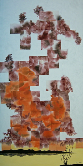 Mixed media painting (refractured watercolor, acrylic). Depiction of clouds at dawn - but with wild colors - orange and dark red. The abstraction of the upper area is counterpointed by the impressionism of the Salton Sea at the bottom. The white part of the sky is textured.