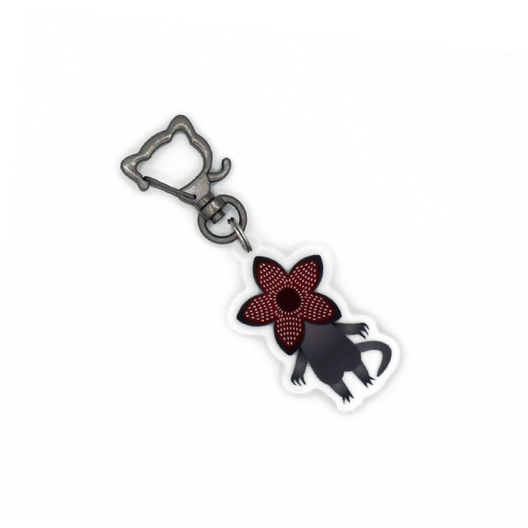 After sneaking out of the Upside Down, this abomination of a creature is ready to prowl I mean...meow? -------------------------------------- Details: 1.75" tall Clear Acrylic Charm Double Sided Image, Same Image Front & Back Waterproof & scratch proof Keychain - Gunmetal Cat Shaped Lobster Clasp Comes with matching vinyl stickers
