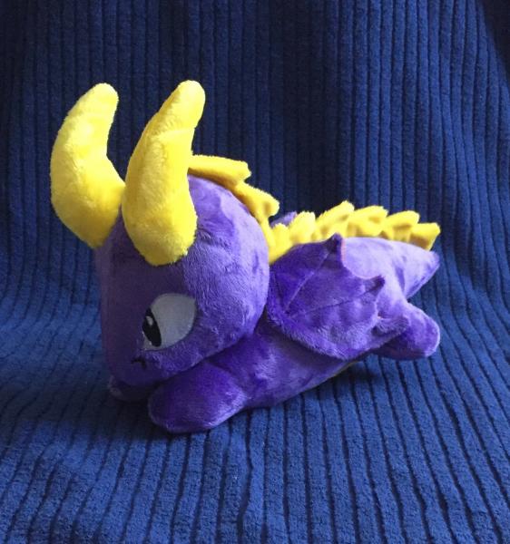 Love Spyro the dragon? Then this stuffed animal is for you! Cuddle with this cute Spyro-inspired dragon plush! Roughly 12" long, 6" wide, and 6" tall, this plushie is handcrafted from soft minky fabric. It is then hand stuffed with polyester fiberfill for a soft and fluffy finish. The face was done with my embroidery machine and the rest carefully completed was completed with a sewing machine.