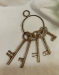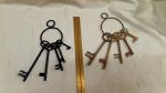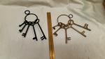 Dungeon keys for display or added costume effect. Black keys are made of steel with a painted finish. The other set is made of brass. Both sets have 5 various sized skeleton keys with a split ring so that others can be added or some removed.