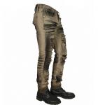 Antiqued brown denim with shreds and black painted detail.