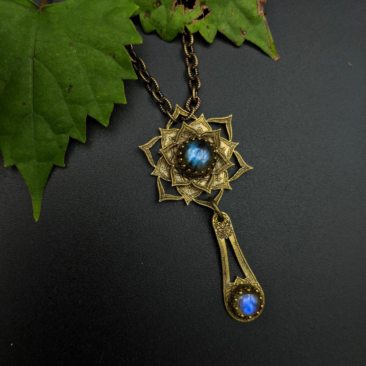 This one-of-a-kind design features a hand-cut brass flower, comprised of two individual layers of hand-etched brass in an intricate flower mandala design. I curled some of the petals up to create dimension around a polished labradorite cabochon, nestled within a brass bezel. Finished with a brass drop, which I hand-etched with a complementing design and another small polished labradorite cabochon. 18-inch long brass chain. This is an eye-catching necklace, is perfect for layering and can easily be dressed up or down.