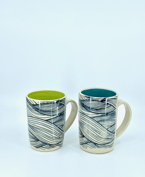 Extra tall mugs with monoprinted exteriors and brightly colored interiors. Fully dishwasher and microwave safe. Holds approx. 18 oz. Each piece is handmade, so sizes may vary by up to 1/2 an inch from listing.