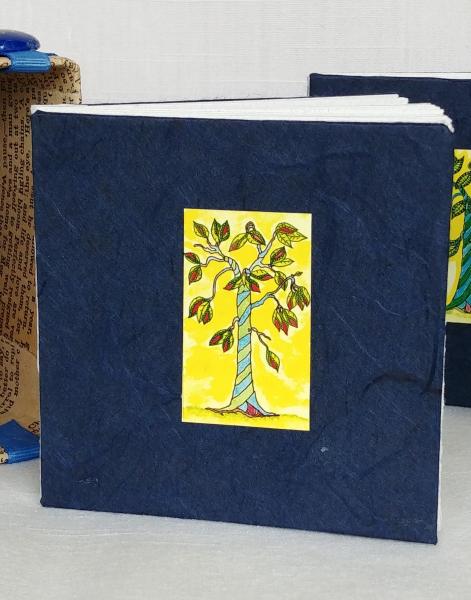 For people who like to watch the seasons change, here is a set of four mini journals, one for each season of the year. Writers can use the journals to note weather conditions, plant and animal appearances, or simply thoughts or poetry. I made the container by covering a small box I had laying around with extra pages from books I had dismantled for other projects. I allowed a little of the decorative original box to show through. I then embellished the container with ribbon and part of a discarded earring. On the front of each mini journal is a copy of my original watercolor and pen drawing of what a fanciful tree might look like in each season. I have handwritten the name of the season on the spine of each book.