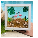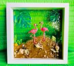 Original resin creation. If you love flamingos, you will love this piece. Created in a box frame with real sand and shells. These two birds are enjoying life. Bring the beach home!