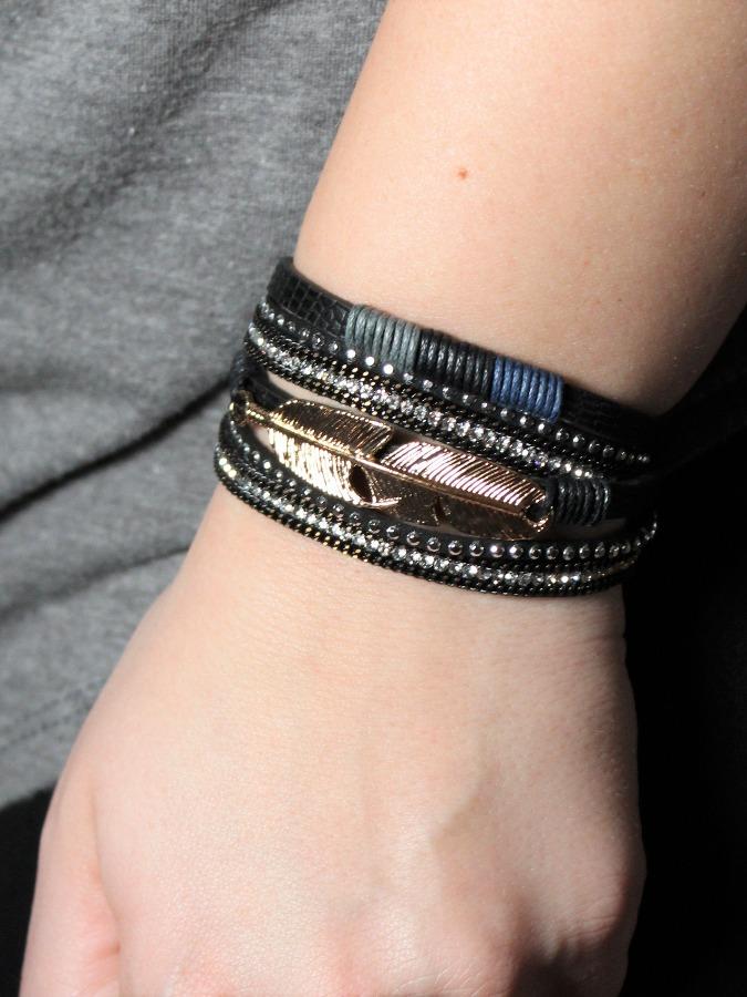 Faux leather rhinestone embedded textured metal feather double wrap bracelet. Length: 14 1/2" Magnetic closure