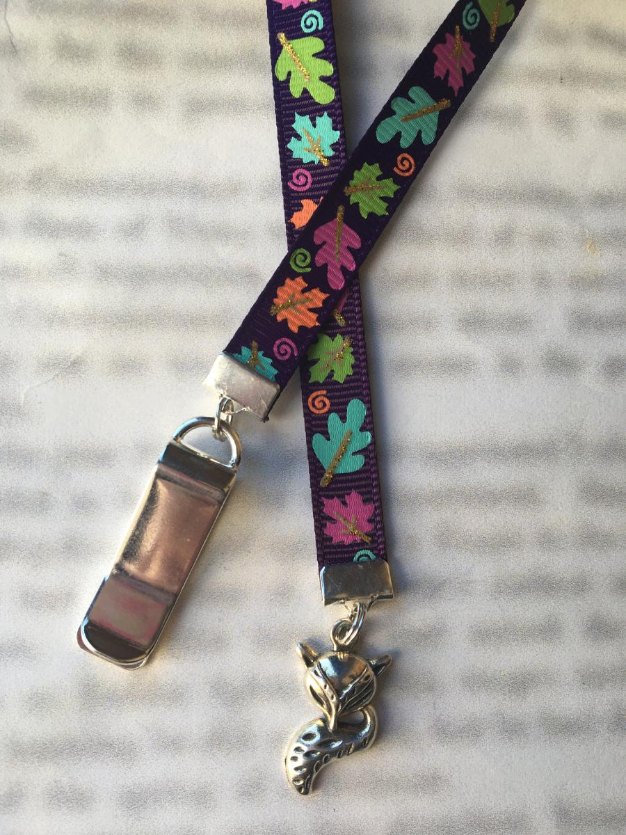 Fox bookmark by Charming Book Clips. My super fun and functional patented ribbon with charm bookmarks feature a special silver clip that attaches to your book cover so you never lose your bookmark. Just slide the clip onto the cover of a paperback or the binding of a hardcover when you start your book, then mark the page with the ribbon. The Fox is a symbol of fortune,luck and the energies of mischief and opportunity. This adorable fox charm with a bushy tail on a ribbon of playful autumn leaves on a plum colored background makes a perfect gift. Ribbon is approximately 12” in length to accommodate various book sizes.