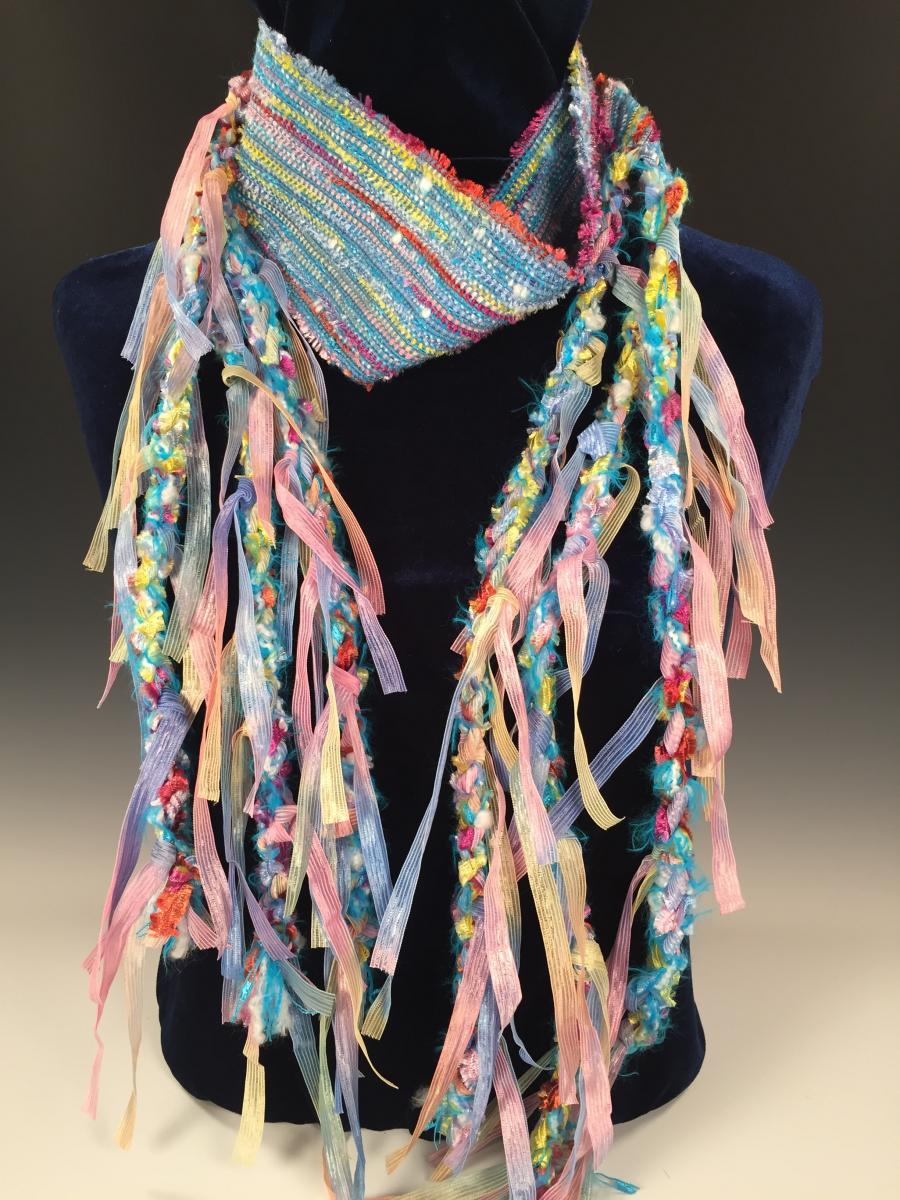 This handwoven scarf with fringe extensions is woven with rayon, cotton and bamboo threads in soft pastel colors with fuzzy turquoise and light blue accents. The handwoven center measures 36" and the fringe extensions are asymmetric measuring between 16" - 18" on each side. Delicate pastel colored ribbons are threaded through the twist of the fringe extensions. The scarf is funky, flirty and fun! Hand wash and line dry.