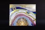 Alcohol inks cast in liquid resin. This Geode Sun takes own personality with the color pallet and golden face. They are 3-5 layers of ink and resin. Mounted on 2" Birch Cradled Panels flooded with a gloss coat of Resin with a gold gilded edge.