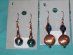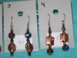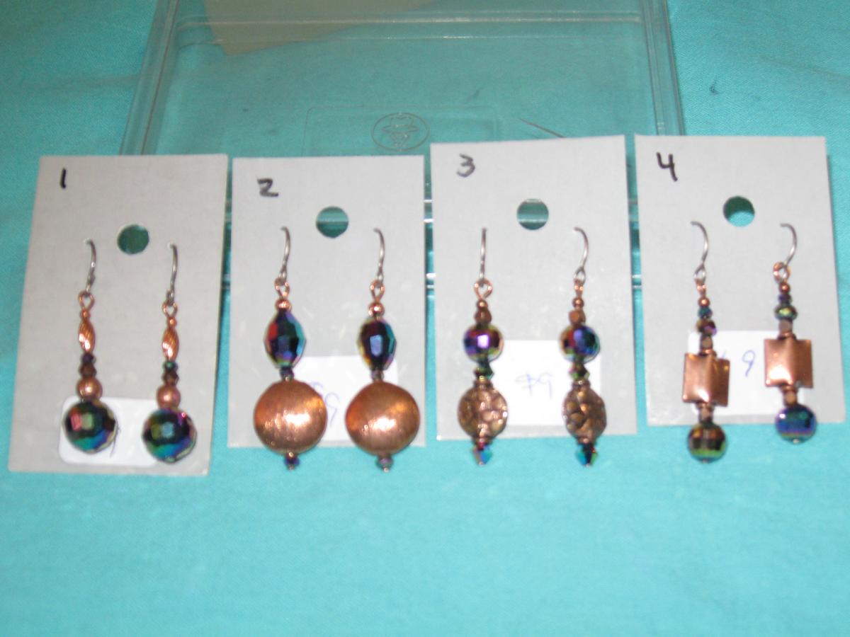 this item is a choice of 1 of the 4 pair of earrings. the beads are mardi gras color glass (gold,pink,purple,green, and blue) with copper color metal beads. each pair is around 1 3/4 inches long. the wires are hypo allergenic.