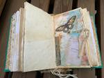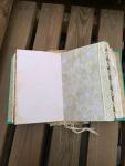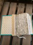 This journal measures approximately 9"x ^ 1/8". It has a hand painted cover with a raised medallion painted in gold and a fabric spine covering. Inside are 5 hand stitched signatures of pages for a total of 200 pages counting front and back. There are book pages, tea, coffee and avocado dyed papers, notebook and scrapbook pages and more. The very center of the book contains a small additional booklet with fold out front and back covers and addition pages for writing inside. There are many pockets, fold outs, trims, ephemera and other surprises throughout the pages of the book. This book has been entirely put together by hand and is one of a kind.