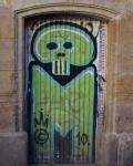 A dull door is covered with graffiti amongst the avenues of Barcelona.