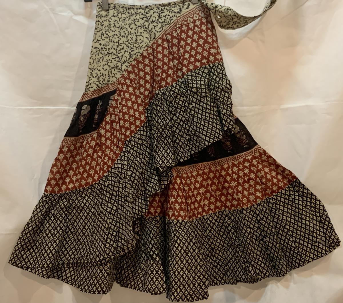 Hand Block Printed pure cotton vegetable dyed Wrap Skirt. The skirt is free size. It can be worn with ties on the side or it can be worn hi lo style. You may also bustle it up. Looks great by itself or layered with another skirt or pantaloons